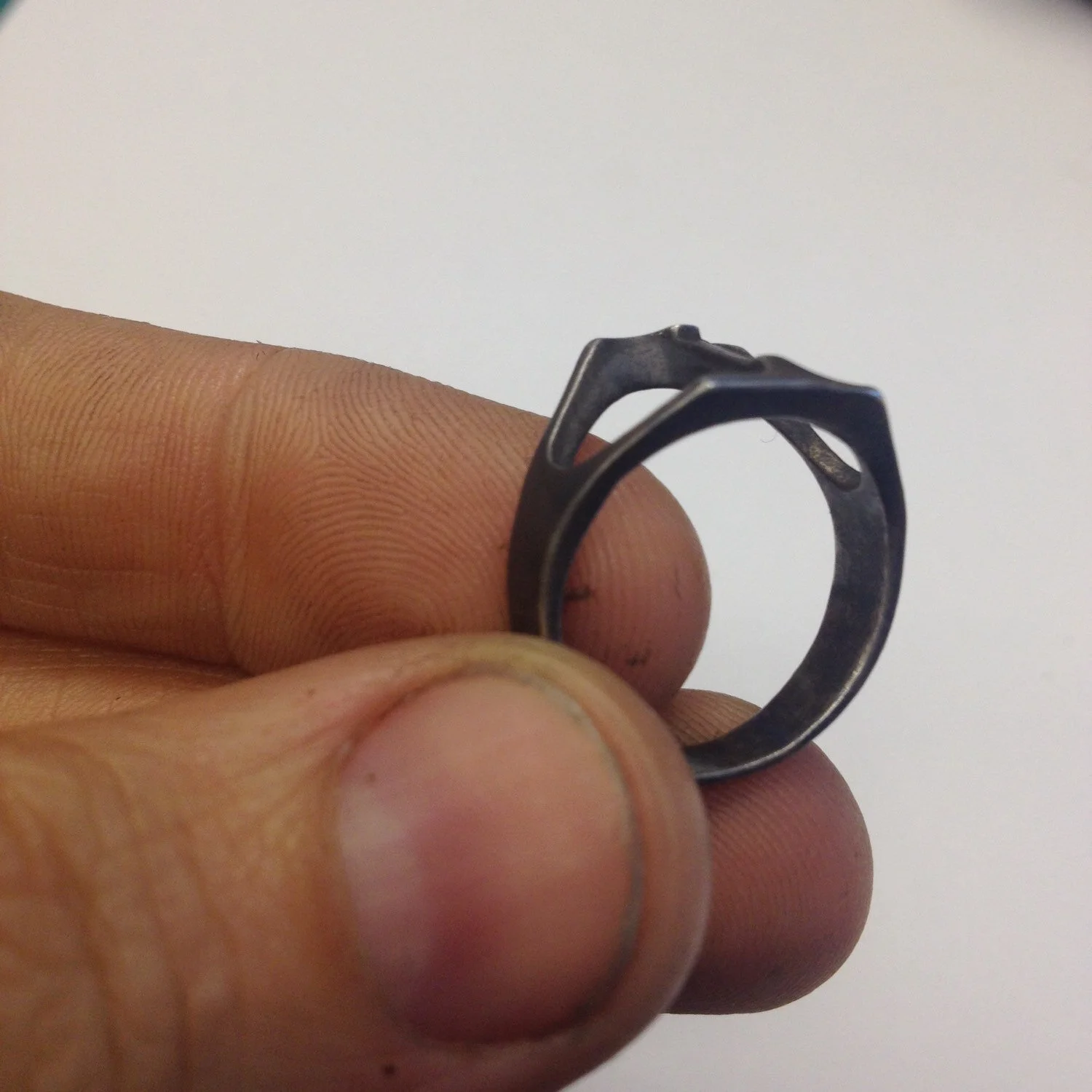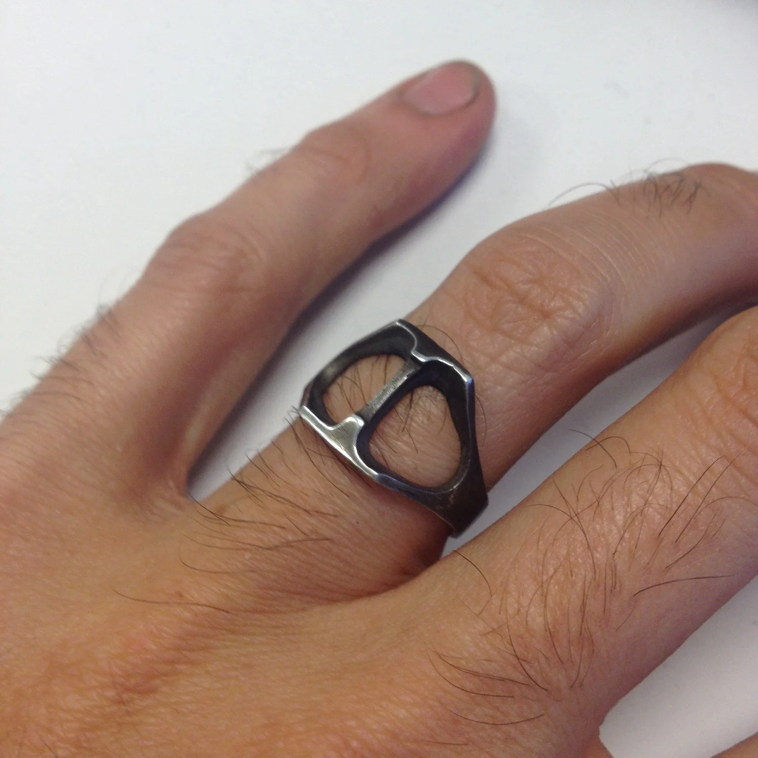 This is a handmade ring, sculpted in wax an cast in sterling silver by myself. The silver is textured, blackened, then brought to a polish on the two areas in the front. .