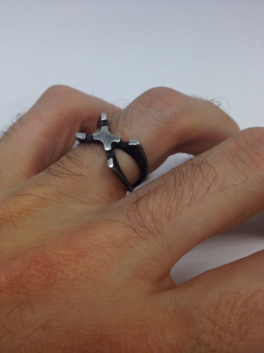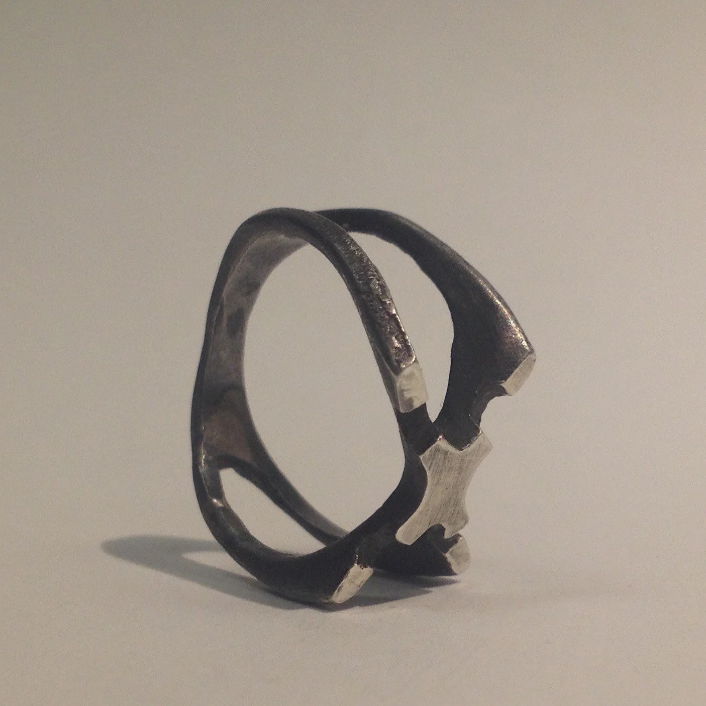 This design is handmade in my home studio in sterling silver. It has a textured surface on the exterior with a polished interior and on a few selective exterior parts. The textured areas have been blackened for contrast. The blackening will wear down over time on the more exposed bits and remain darker in the pits and recesses. This design is made to order with a 2-3 week production time. If time is a concern, check my "Ready to Ship" section as I may have one in your size on hand.