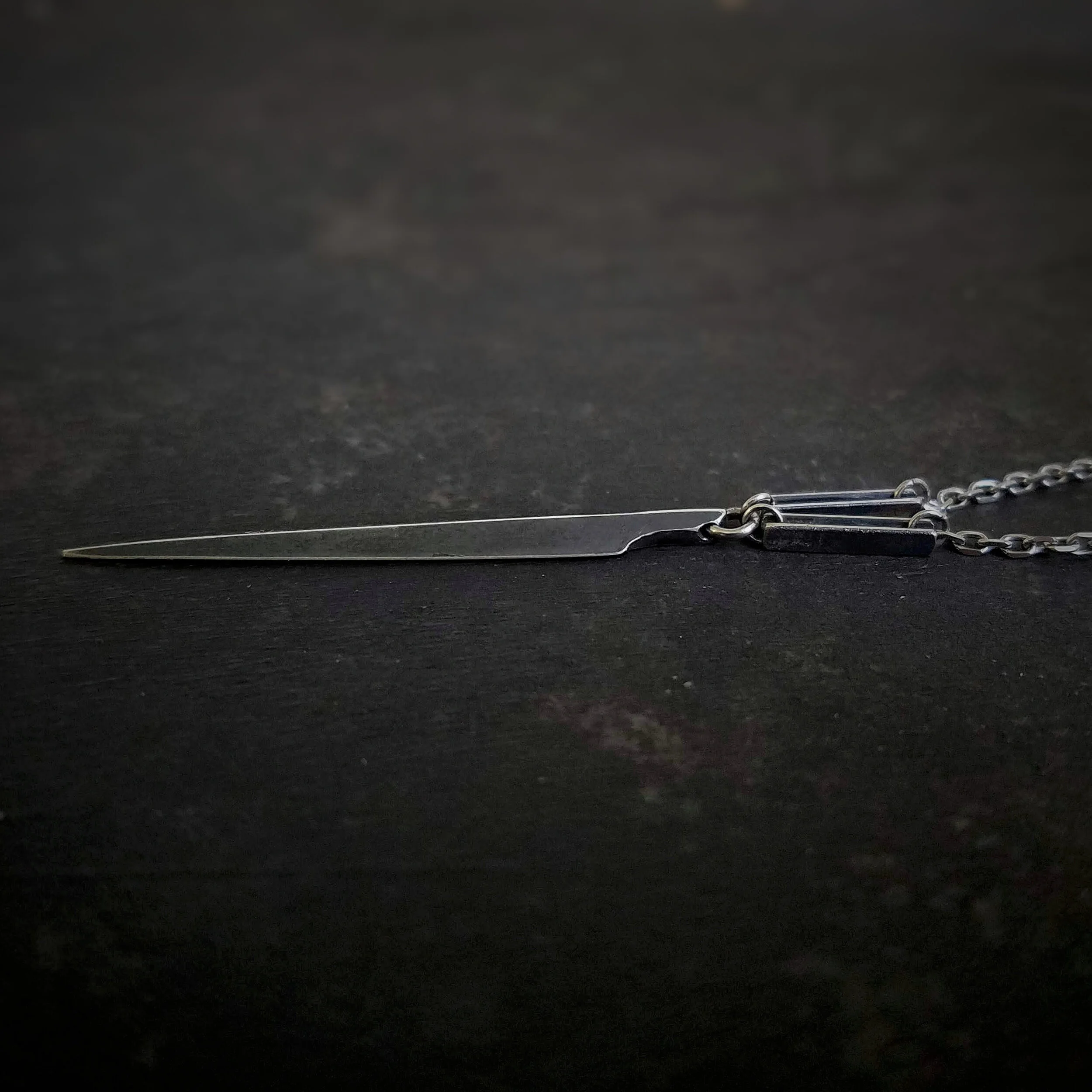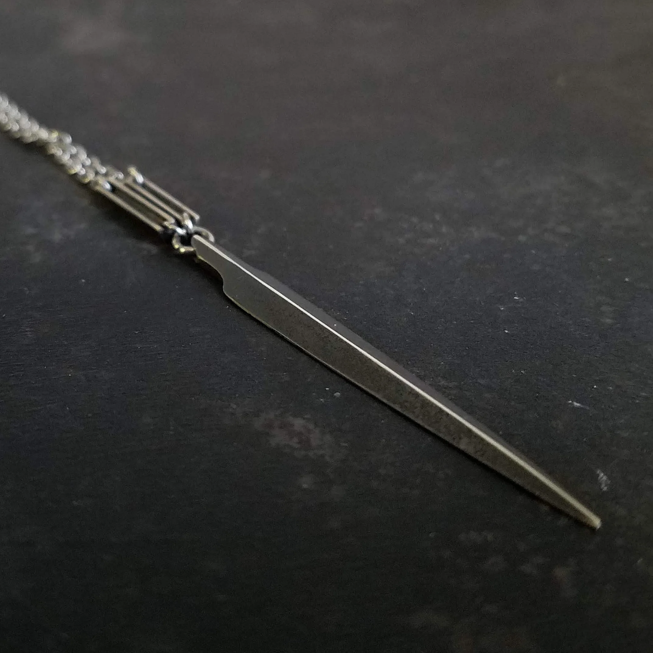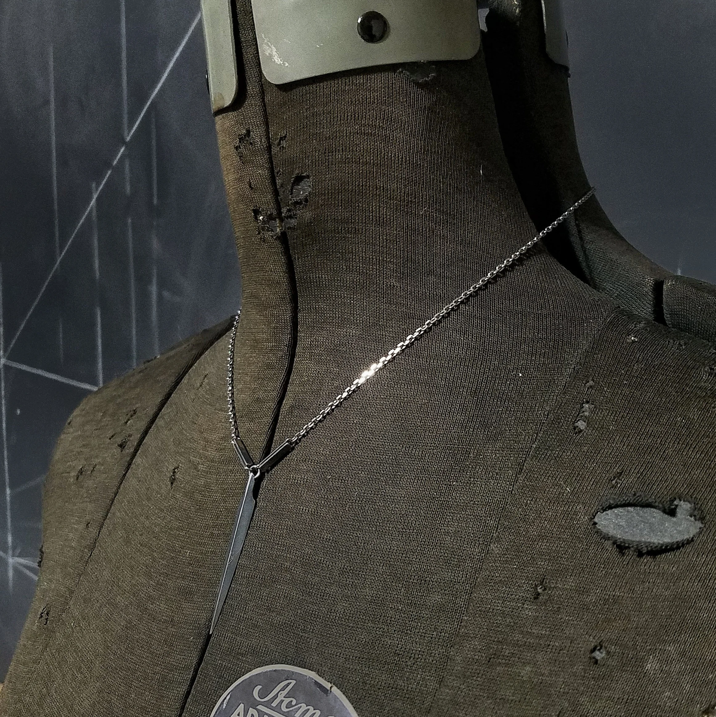 Handmade silver pendant with two sections of handmade silver "H" beams attached to a faceted stainless steel chain. The silver has been blackened and polished on the edges in order for the contrast to accentuate the geometric forms. The pendant itself measures 45mm (1 3/4").  The chain is 16" with an extra 2" extension for a total of 18".