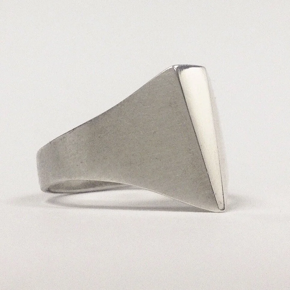 Triangular Wedge Ring.  This is a handmade ring, sculpted in wax an cast in sterling silver by myself. The silver is has a satin finish on the sides and is brought to a high polish on the front.