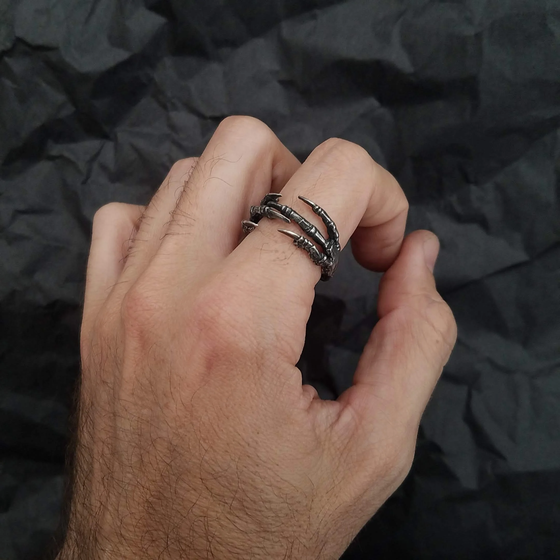 This ring is sculpted from a pair of talons cast in sterling silver. The claws themselves are the band, front and back, so it cannot have material added to or removed from it. It can be opened or closed more however, so can accommodate a range of sizes, and with care, the size can easily be adjusted by the wearer. As pictured, the ring is sized to a 10. The claws will overlap more or less for smaller or larger sizes. I also have two other versions of this ring design in my shop, both of which are constructed with more delicate talons. This one is quite hefty, and better suited for individuals with larger hands.