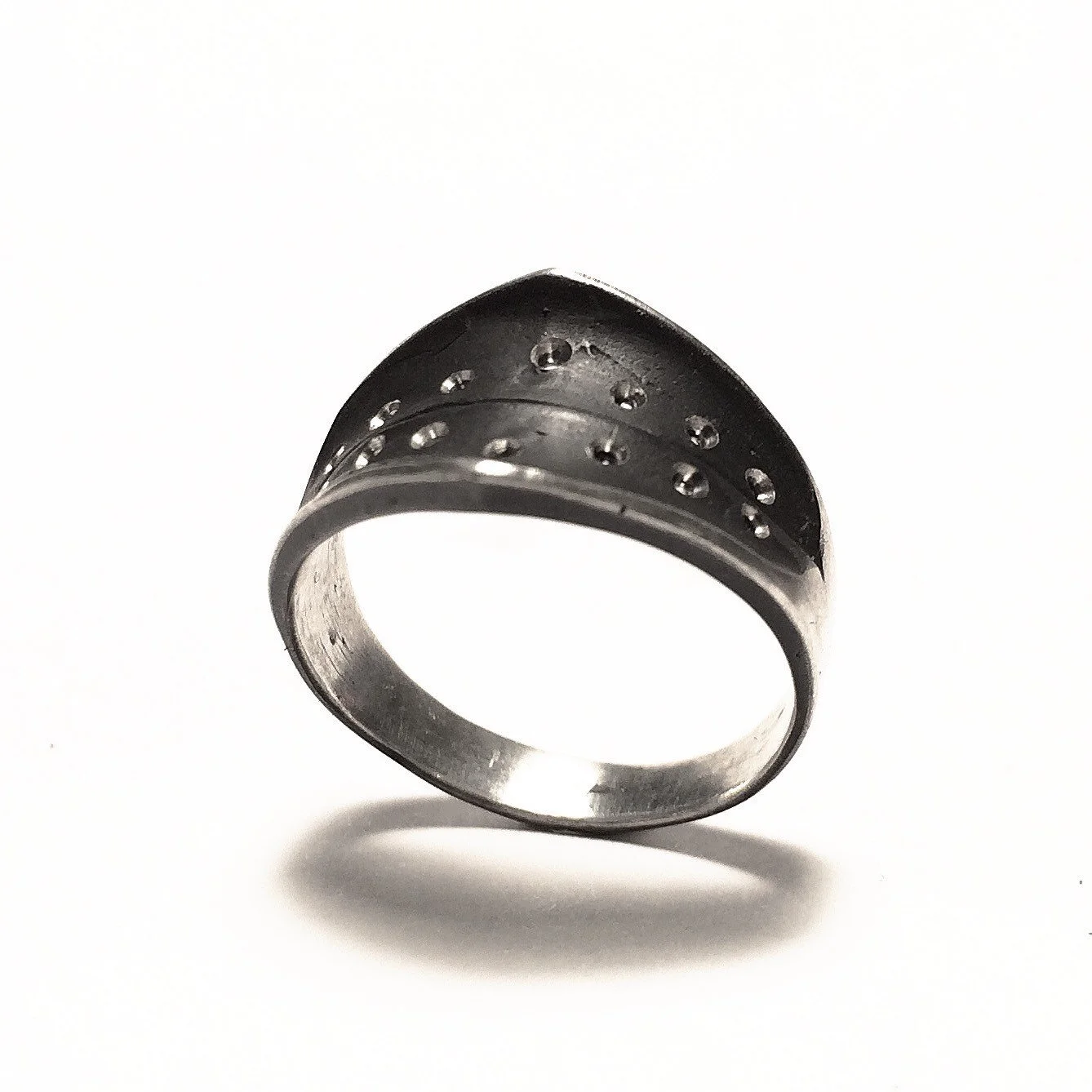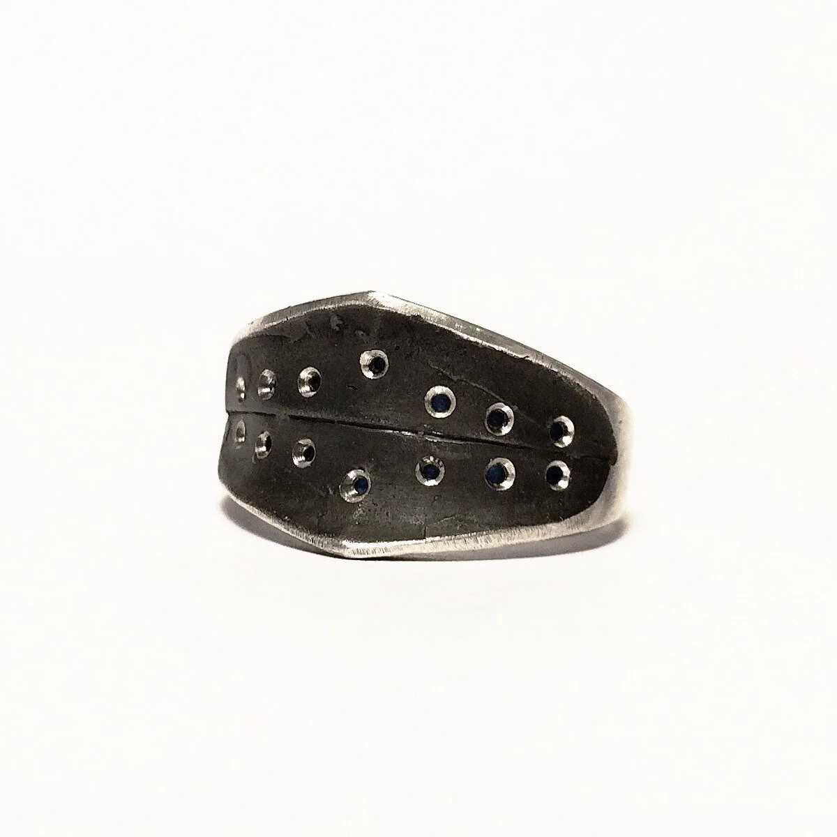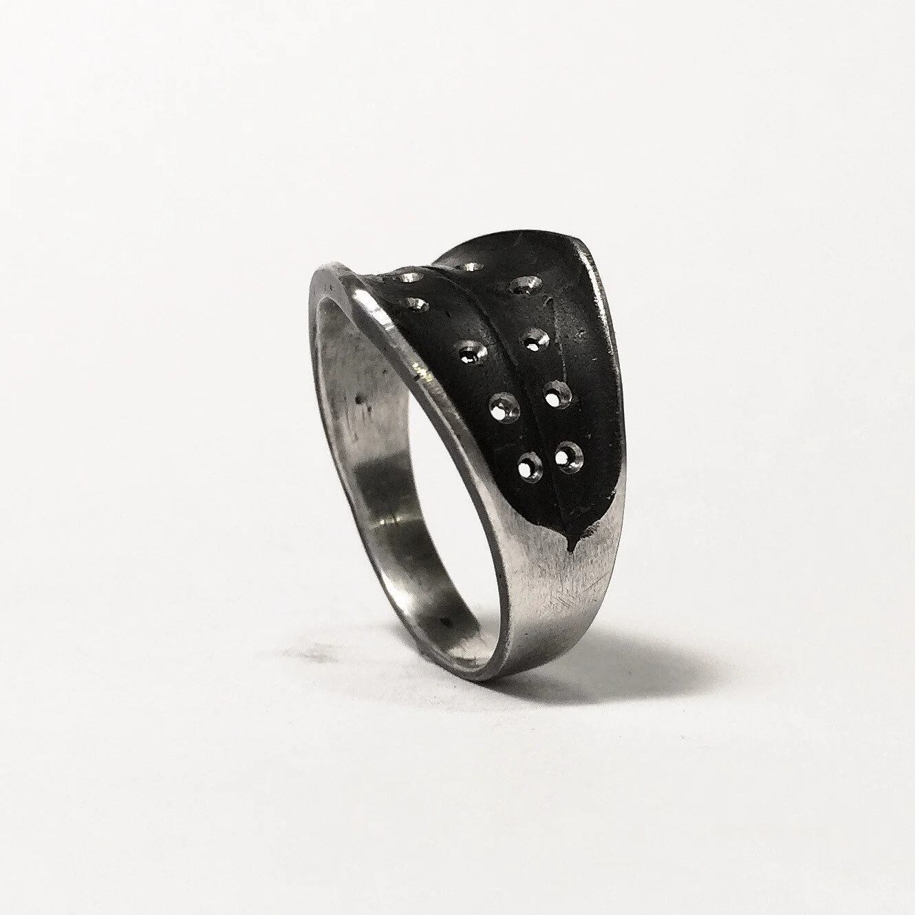This is a handmade ring, sculpted in wax an cast in sterling silver by myself. The silver is textured and blackened, then brought to a polish in select areas for contrast. See my corset ring design for a variation with wires stitched through the holes.