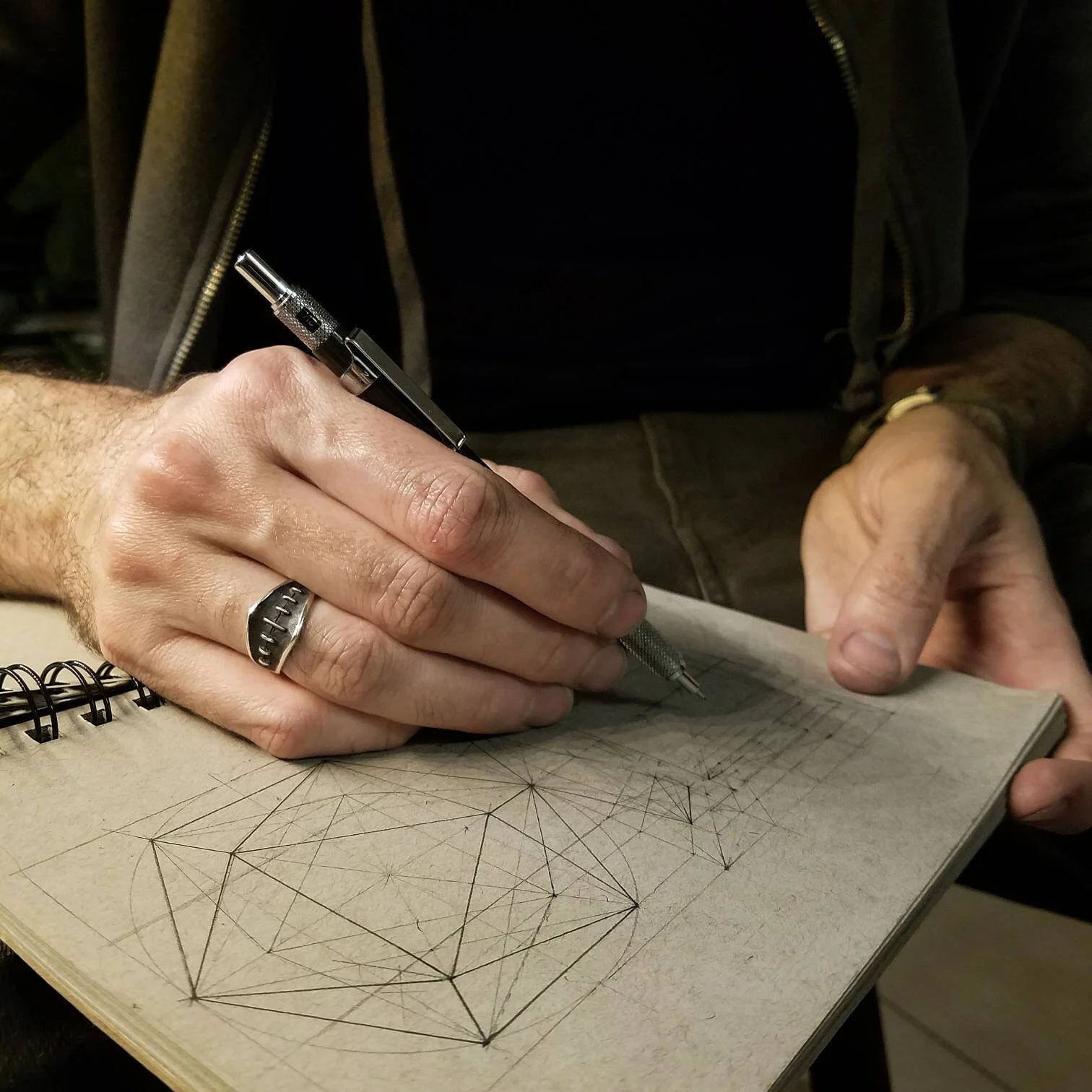 This is a handmade ring, sculpted in wax an cast in sterling silver by myself. Silver wires are stitched and soldered into place. The silver is textured and blackened, then brought to a polish in select areas for contrast.